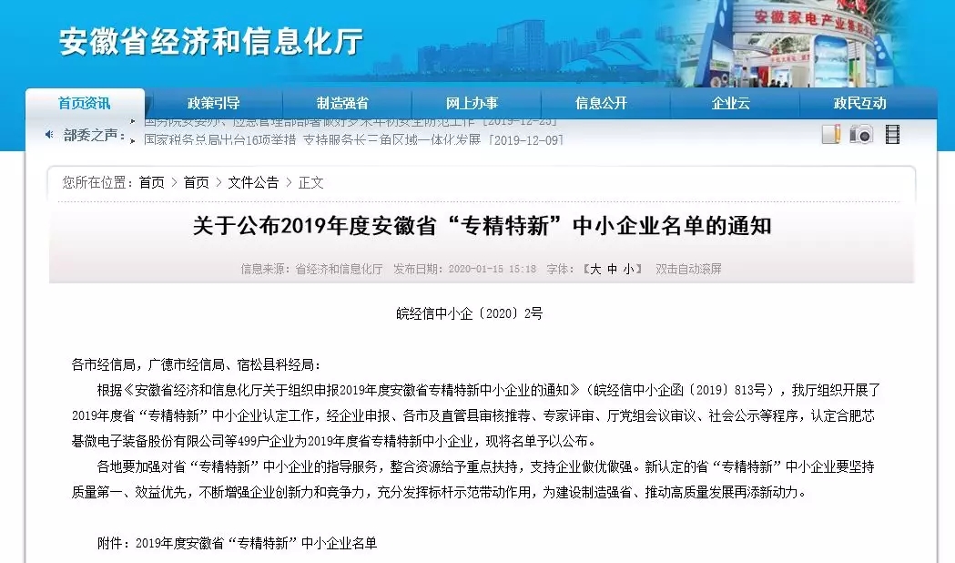 2019年安徽省新認(rèn)定安徽心里程等500戶(hù)企業(yè)為“專(zhuān)精特新”中小企業(yè)