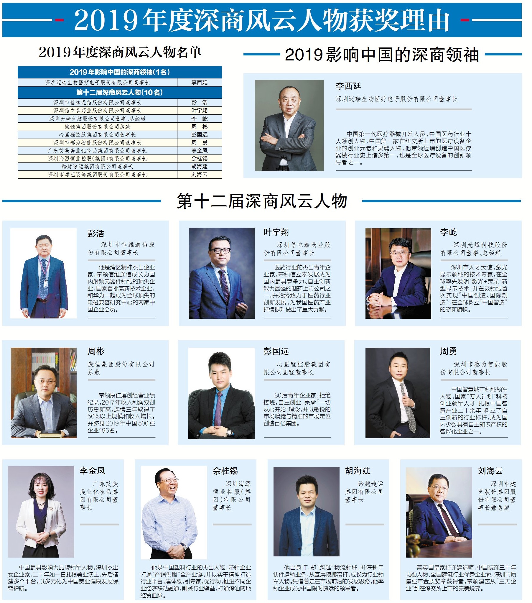 12月22日,被譽(yù)為深商經(jīng)濟(jì)奧斯卡大獎(jiǎng)的“深商風(fēng)云人物”評(píng)選榜單新鮮出爐,邁瑞集團(tuán)董事長(zhǎng)李西廷被評(píng)為2019年“影響中國(guó)的深商領(lǐng)袖”;信維通信董事長(zhǎng)彭浩,信立泰藥業(yè)董事及總經(jīng)理葉宇翔,光峰科技創(chuàng)始人、董事長(zhǎng)李屹,康佳集團(tuán)總裁周彬,心里程控股集團(tuán)有限公司董事長(zhǎng)彭國(guó)遠(yuǎn),深圳市賽為智能股份有限公司董事長(zhǎng)周勇,廣東艾美美業(yè)化妝品集團(tuán)有限公司董事長(zhǎng)李金鳳,深圳海源恒業(yè)控股(集團(tuán))有限公司董事長(zhǎng)佘桂錫,跨越速運(yùn)集團(tuán)有限公司董事長(zhǎng)胡海建,深圳市建藝裝飾集團(tuán)股份有限公司董事長(zhǎng)劉海云10位企業(yè)家被評(píng)為第十二屆“深商風(fēng)云人物”。