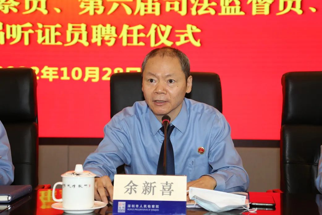 深圳市檢察院黨組副書(shū)記、副檢察長(zhǎng)余新喜主持本次聘任儀式。他首先對(duì)各位來(lái)賓表示熱烈歡迎與衷心感謝,并說(shuō)到,聘任特約檢察員、司法監(jiān)督員、聽(tīng)證員是貫徹落實(shí)習(xí)近平法治思想、習(xí)近平總書(shū)記關(guān)于落實(shí)全過(guò)程人民民主以及加強(qiáng)和改進(jìn)統(tǒng)一戰(zhàn)線(xiàn)工作重要思想的一項(xiàng)具體舉措,也是健全檢察外部監(jiān)督制約機(jī)制,深化司法改革,加強(qiáng)檢務(wù)公開(kāi)的重要保證。