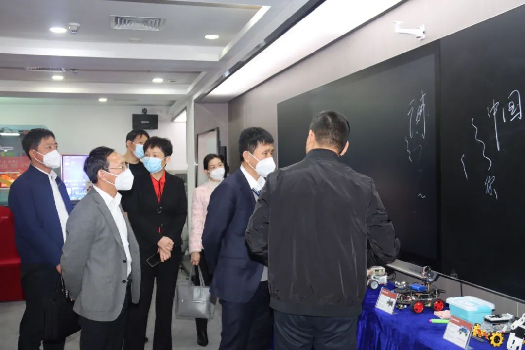 廣東心里程產(chǎn)業(yè)投資集團(tuán)副董事長(zhǎng)張玉(右一)向匡曉衛(wèi)書記(右二)介紹心里程智慧教育產(chǎn)品