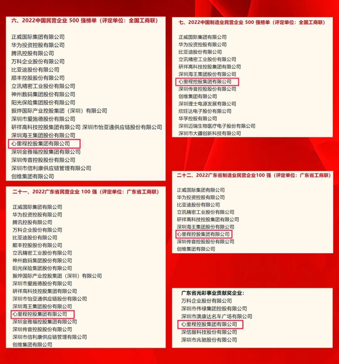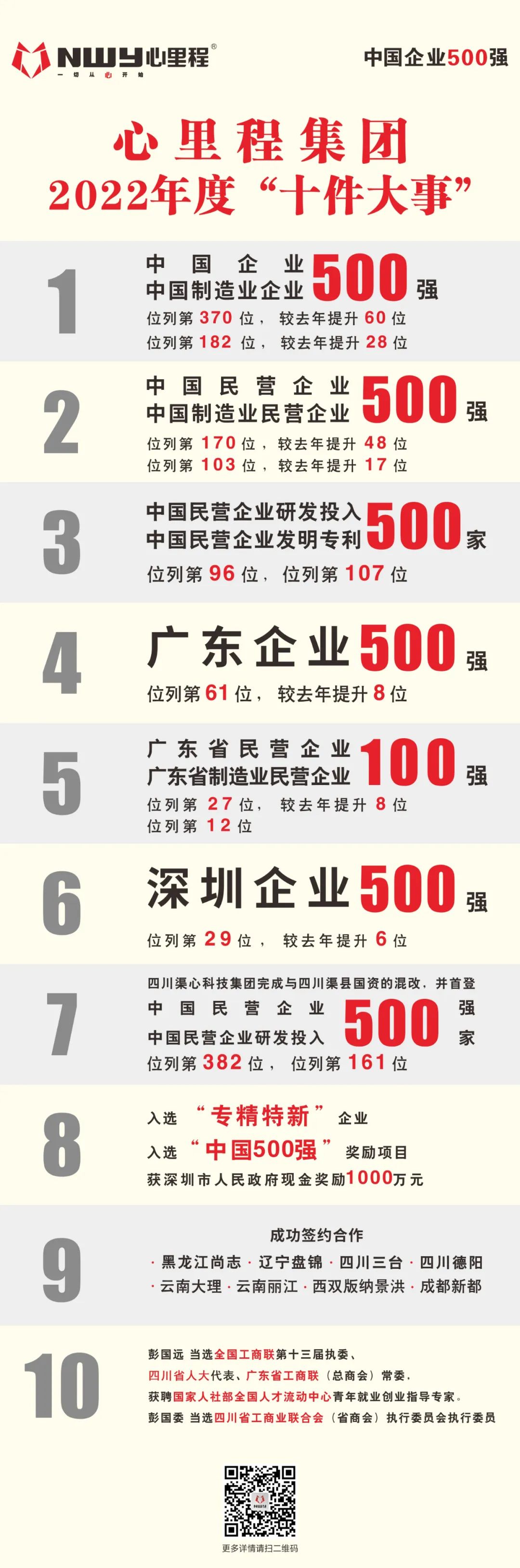 2022年是心里程集團(tuán)碩果累累的一年,同年,心里程集團(tuán)還榮登了“2022中國企業(yè)500強(qiáng)”榜單第370位、“2022中國制造業(yè)企業(yè)500強(qiáng)” 榜單第182位、“中國民營企業(yè)研發(fā)投入500家”榜單第96位、“中國民營企業(yè)發(fā)明專利500家”第107位、“2022廣東企業(yè)500強(qiáng)”榜單第61位、“2022深圳企業(yè)500強(qiáng)”榜單第29位。