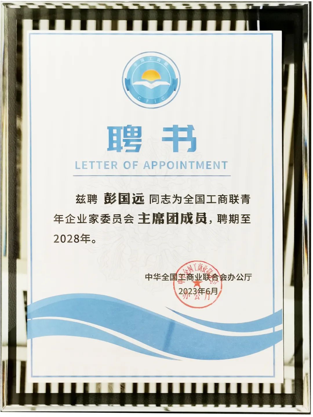 彭國(guó)遠(yuǎn)董事長(zhǎng)當(dāng)選全國(guó)工商聯(lián)青年企業(yè)家委員會(huì)主席團(tuán)成員聘書