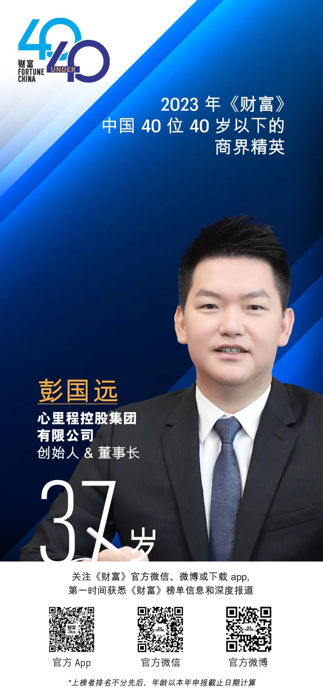 7月18日,全球最具影響力的商業(yè)雜志之一《財(cái)富》(FORTUNE)發(fā)布了2023年“40位40歲以下的商界精英”(《FORTUNE》40 under 40 Business Leader)榜單,心里程控股集團(tuán)創(chuàng)始人?董事長(zhǎng)彭國(guó)遠(yuǎn)榮登該榜單。