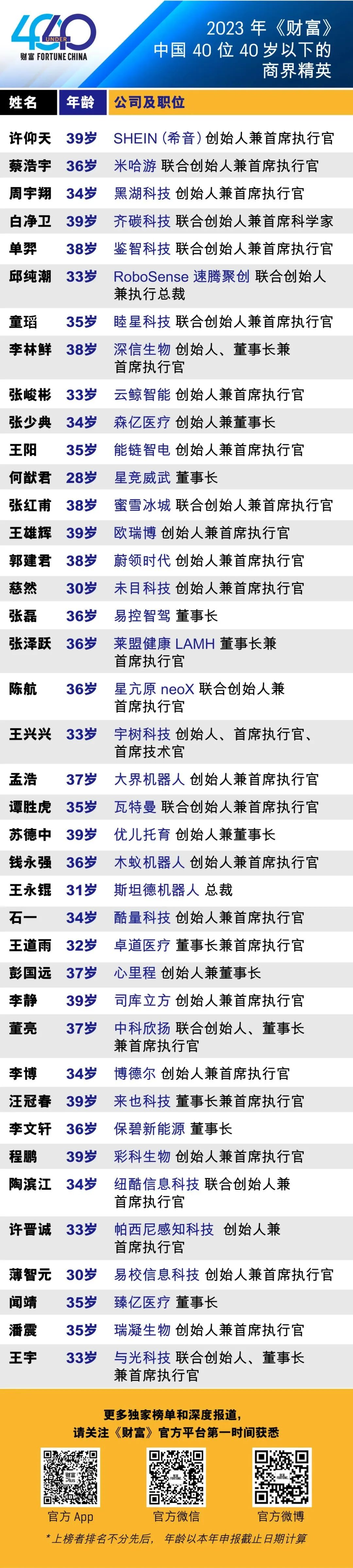 據(jù)了解,自2011年起,《財(cái)富》推出“中國(guó)40位40歲以下的商界精英”榜單,旨在挖掘中國(guó)年輕的杰出創(chuàng)新者、價(jià)值締造者和變革者,該榜單被稱為“商業(yè)巨星搖籃”,已成為具有影響力的青年領(lǐng)袖評(píng)選之一。劉強(qiáng)東、馬化騰、張一鳴、丁磊等企業(yè)家都曾入選該榜單。2023年入選該榜單的商界精英分別置身于新能源、新消費(fèi)、人工智能、智能駕駛、生命科學(xué)等多個(gè)領(lǐng)域,這些創(chuàng)業(yè)者們用對(duì)科學(xué)的駕馭和創(chuàng)造,以及持續(xù)不斷的再創(chuàng)造能力,使得他們的企業(yè),乃至整個(gè)行業(yè)為之發(fā)生了顛覆式的進(jìn)化。