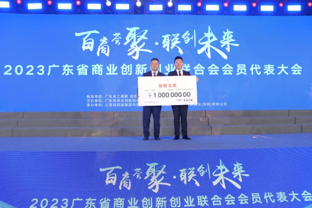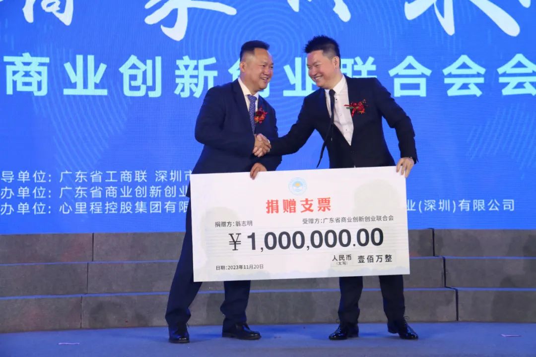 翁志明執(zhí)行會長向廣東省商業(yè)創(chuàng)新創(chuàng)業(yè)聯(lián)合會捐贈100萬元人民幣,彭國遠(yuǎn)會長上臺接受了捐贈。