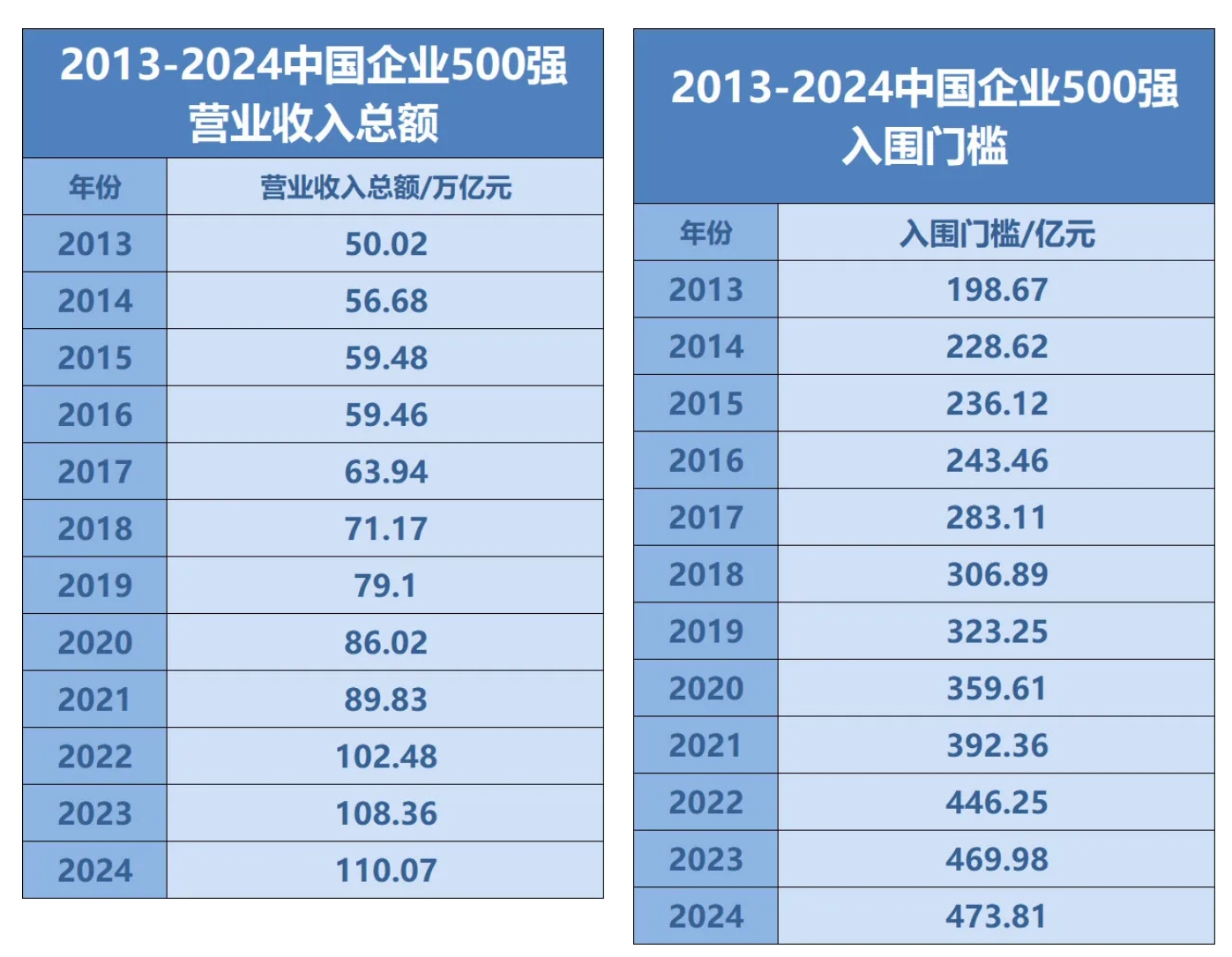 據(jù)悉,2024中國企業(yè)500強營業(yè)收入邁上新臺階,突破了110萬億元大關(guān),達110.07萬億元,較上年相比增長1.58%。其入圍門檻達到473.81億元,提升3.83億元,實現(xiàn)22連升。