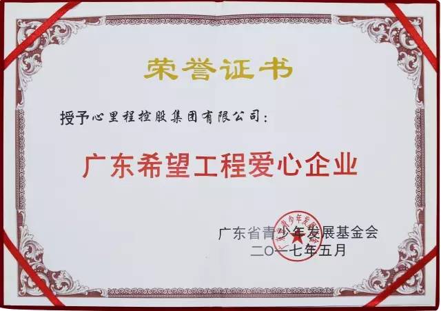 2017年5月【廣東省青少年發(fā)展基金會】授予【廣東心里程控股集團(tuán)】廣東希望工程愛心企業(yè)的稱號。