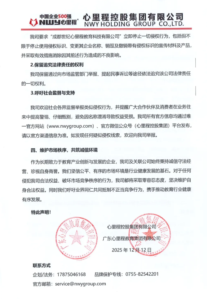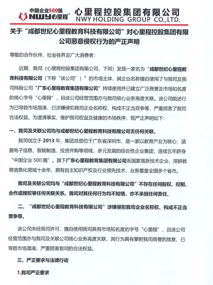 近期,我司(心里程控股集團有限公司,下同)發(fā)現一家名為“成都世紀心里程教育科技有限公司(下稱“該公司”)”的市場主體,其企業(yè)名稱擅自使用了與我司及我司持股公司“廣東心里程教育集團有限公司”持續(xù)使用并已建立廣泛商譽及市場知名度的核心字號“心里程”,且該公司經營范圍亦與我司核心業(yè)務高度關聯。該公司前述行為已導致市場混淆,已涉嫌侵犯我司企業(yè)名稱權、構成不正當競爭等,嚴重損害了我司合法權益。為澄清事實,維護我司權益及健康的市場秩序,現嚴正聲明如下: