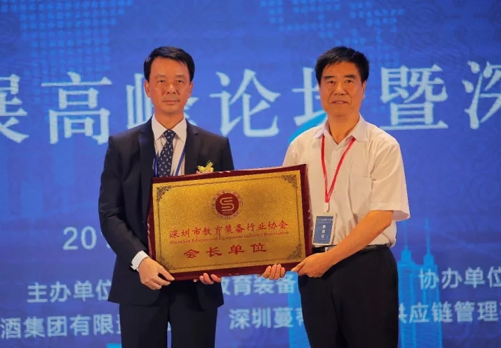 ▲心里程教育集團總裁彭錦環(huán)(左)接受中國教育裝備行業(yè)協(xié)會會長王富授予的深圳市教育裝備行業(yè)協(xié)會會長單位榮譽牌匾