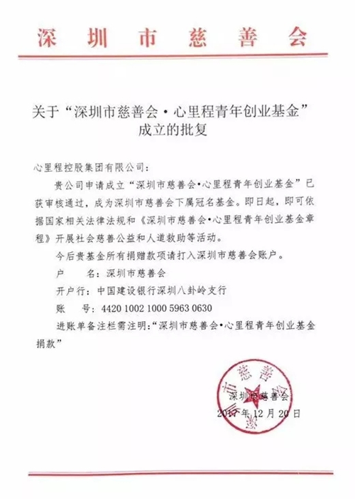 2018新年伊始,心里程控股集團(tuán)接收到了深圳慈善會(huì)開具的捐贈(zèng)發(fā)票及其頒發(fā)的捐贈(zèng)證書,這是“深圳市慈善會(huì)·心里程青年創(chuàng)業(yè)基金”成立以來,心里程集團(tuán)向深圳慈善會(huì)捐贈(zèng)的首筆款項(xiàng)。