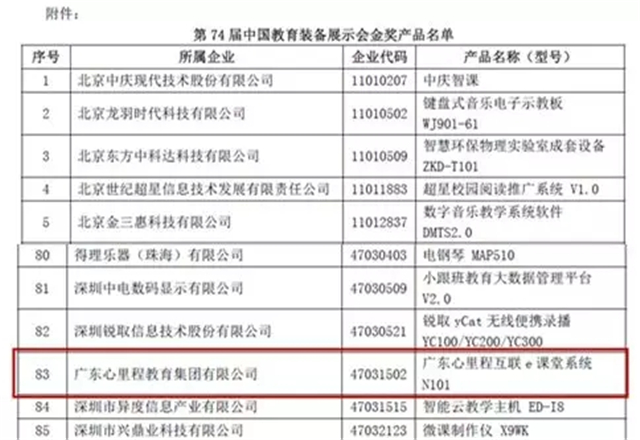 6月8日,中國教育裝備行業(yè)協(xié)會公布了“第74屆中國教育裝備展示會金獎產(chǎn)品評選結(jié)果”,廣東心里程教育集團有限公司的【廣東心里程互聯(lián)e課堂系統(tǒng)N101】榮獲金獎產(chǎn)品!