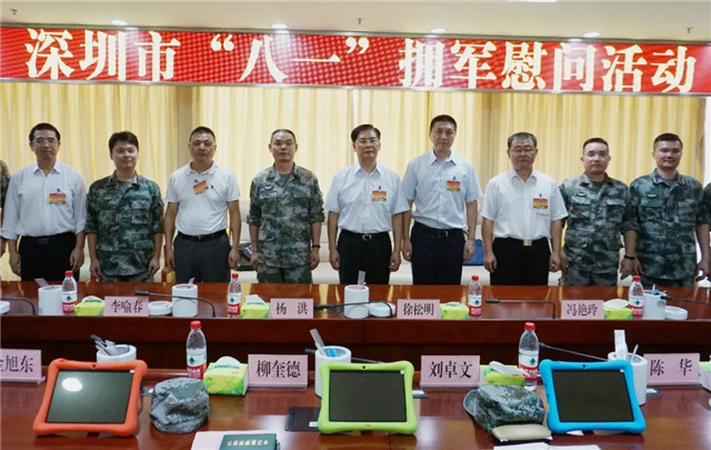 深圳市委常委、市政府黨組成員、廣東陸軍預(yù)備役高射炮兵師第五團(tuán)第一政委楊洪率深圳市"八一"擁軍慰問團(tuán)一行慰問部隊官兵。心里程控股集團(tuán)董事、副總裁彭國委(左二)作為民營企業(yè)代表出席慰問活動。