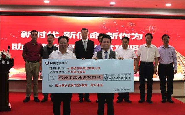 為切實(shí)踐行企業(yè)公民的社會(huì)責(zé)任,助力家鄉(xiāng)打贏脫貧攻堅(jiān)戰(zhàn),資助青年創(chuàng)業(yè)和教育扶貧,在今年的扶貧濟(jì)困日活動(dòng)中,心里程控股集團(tuán)董事長(zhǎng)彭國(guó)遠(yuǎn)代表心里程集團(tuán),向自己的家鄉(xiāng)——廣東省汕尾市捐款2018萬(wàn)元人民幣。