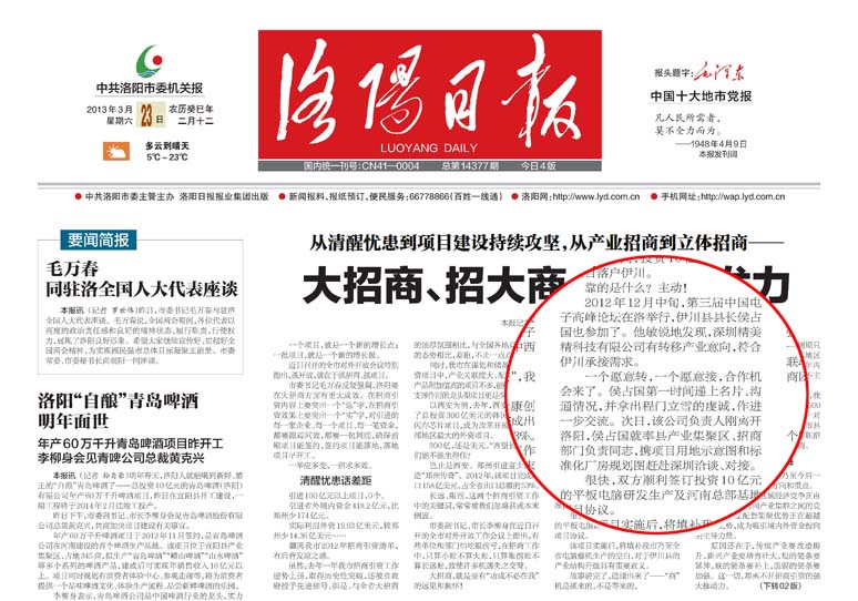 《洛陽日報》頭版報道我司投資項目情況