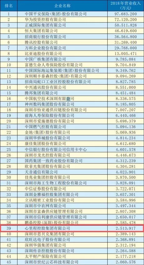 由深圳市企業(yè)聯(lián)合會(huì)、深圳市企業(yè)家協(xié)會(huì)(以下簡(jiǎn)稱深圳企聯(lián))編撰的《2019深圳500強(qiáng)企業(yè)發(fā)展報(bào)告》即將正式對(duì)外發(fā)布。《2019深圳500強(qiáng)企業(yè)發(fā)展報(bào)告》中的“2019深圳500強(qiáng)企業(yè)”名單于今日在《深圳商報(bào)》予以公示,心里程控股集團(tuán)排名第39位,比較去年前進(jìn)了27名。