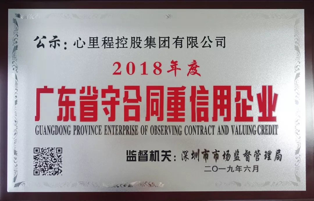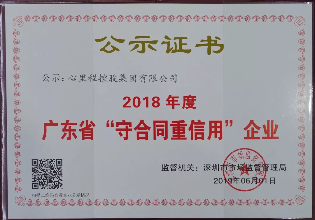 近日,廣東省市場(chǎng)監(jiān)督管理局對(duì)“2018年度守合同重信用企業(yè)”進(jìn)行了公示,心里程控股集團(tuán)以自身良好的信用體系及誠(chéng)實(shí)守信的企業(yè)形象,榮獲“2018年度廣東省守合同重信用企業(yè)”稱號(hào)。