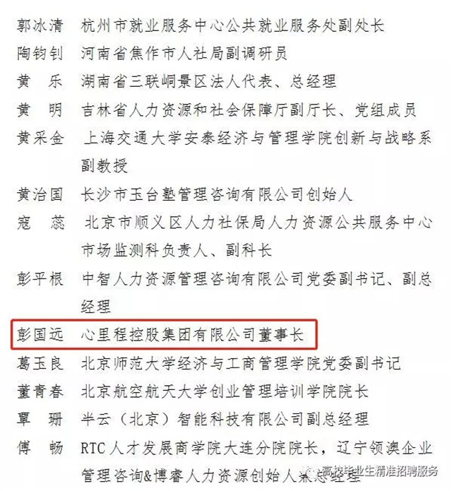 為進(jìn)一步健全和完善高校畢業(yè)生就業(yè)創(chuàng)業(yè)服務(wù)體系,充分發(fā)揮專家團(tuán)隊(duì)在就業(yè)創(chuàng)業(yè)服務(wù)領(lǐng)域的積極作用,更好地為高校畢業(yè)生提供多方位指導(dǎo)和精細(xì)化服務(wù),提升其就業(yè)創(chuàng)業(yè)競(jìng)爭(zhēng)力,促進(jìn)更加充分和更高質(zhì)量就業(yè),日前,人力資源社會(huì)保障部全國(guó)人才流動(dòng)中心公布了68位全國(guó)人才流動(dòng)中心高校畢業(yè)生就業(yè)創(chuàng)業(yè)指導(dǎo)專家的名單,心里程控股集團(tuán)董事長(zhǎng)彭國(guó)遠(yuǎn)入選。