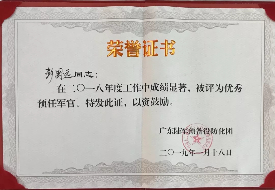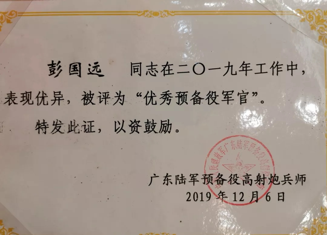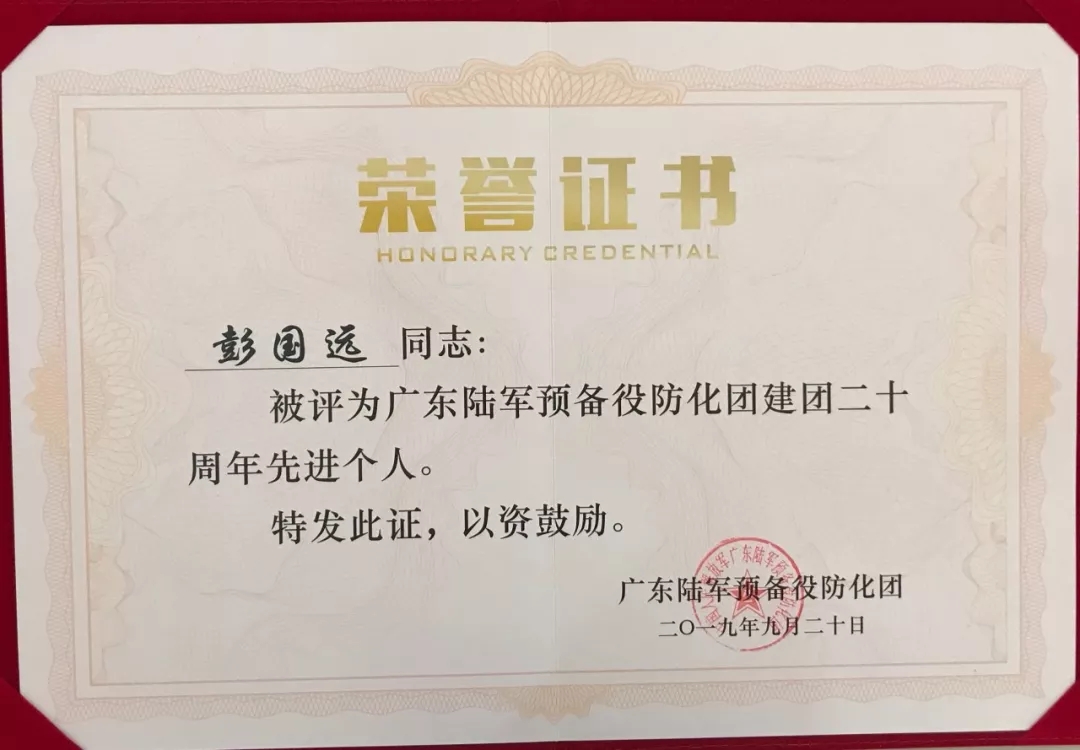 2019彭國(guó)遠(yuǎn)榮獲廣東陸軍預(yù)備役防化團(tuán)建團(tuán)二十周年先進(jìn)個(gè)人